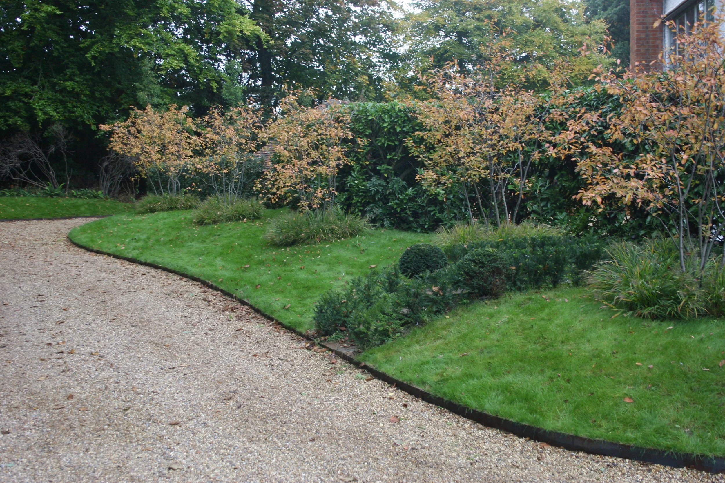 New driveway design, build and plant in Harpsden. Steel edging accentuating the driveway curves. Lovely Autumn colour from the Amelanchiers.